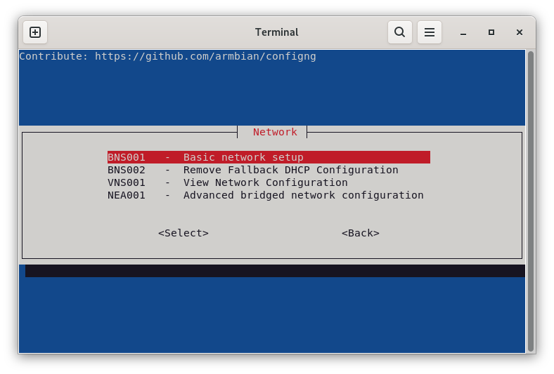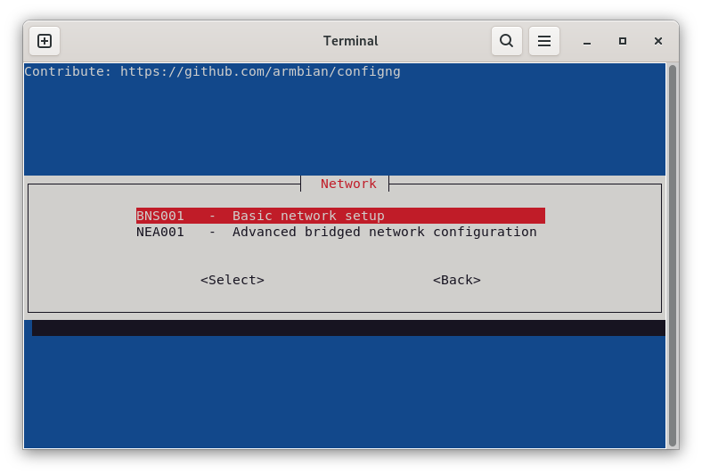 Une fois armbian-config ouvert, la navigation se fait en déplaçant la sélection avec les flèches du clavier et la touche « Tab » pour aller sur « Select », « Exit », « OK » et « Back », puis en validant la sélection avec la touche « Entrée ».