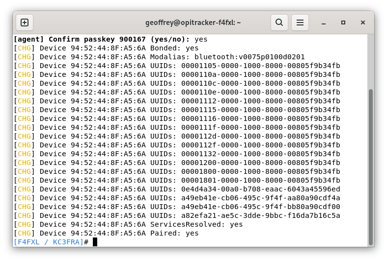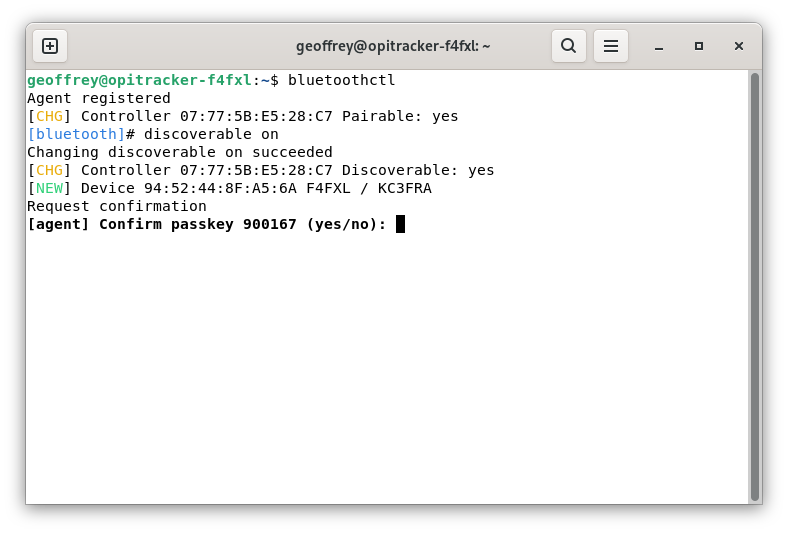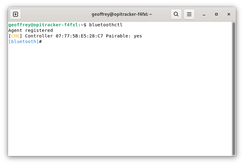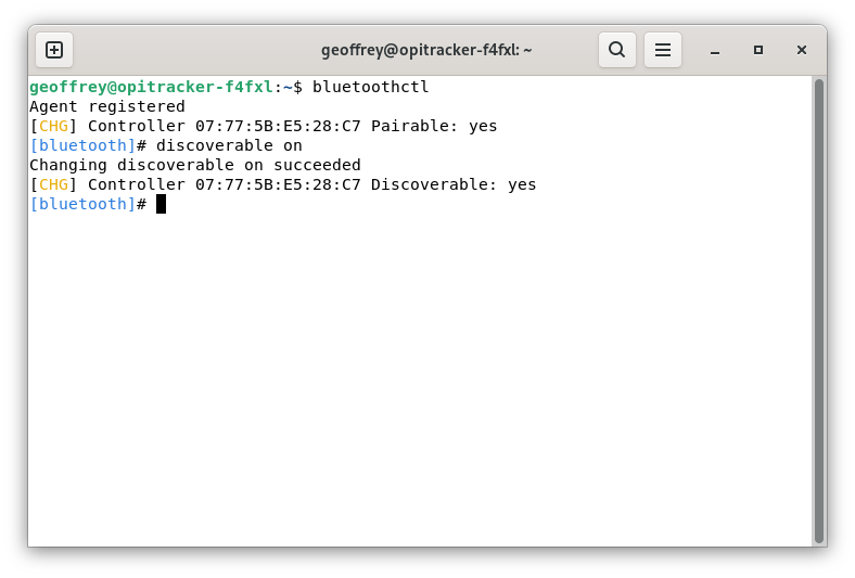 Une fois dans bluetoothctl on rend notre opitracker visible pour les autres appareils bluetooth via la commande :