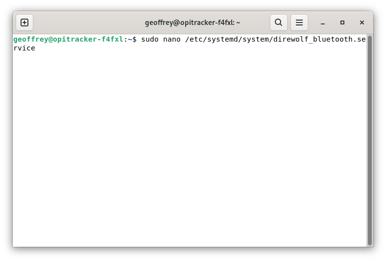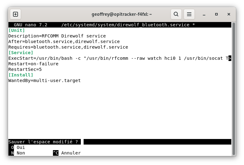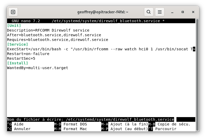 Ensuite nous créons le fichier /etc/systemd/system/direwolf_bluetooth.service en utilisant nano. Les combinaisons de touche pour naviguer dans nano doivent être connues à ce stade.