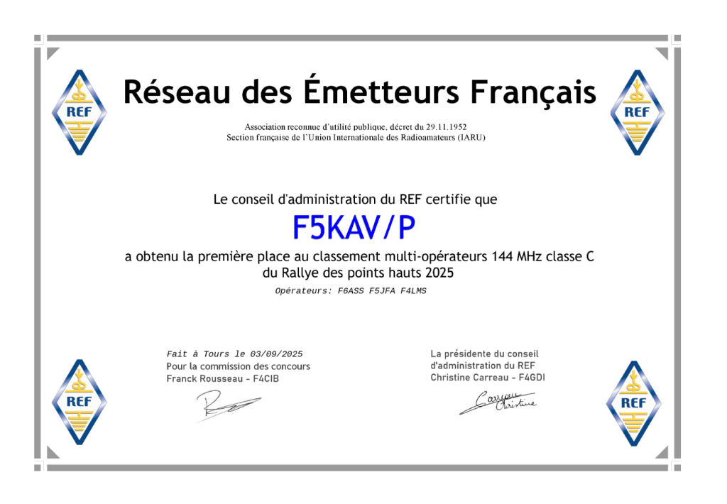 C’est avec une grande fierté que nous avons pris connaissance de notre première place au classement, catégorie multi-opérateurs 144MHz, au concours « Rallye des Points Hauts ».