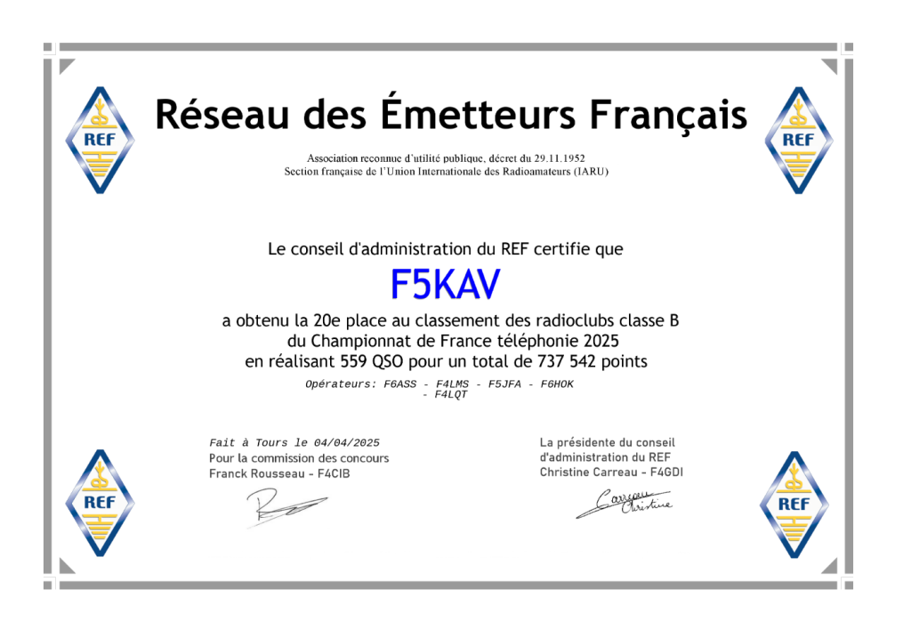Un grand bravo aux opérateurs impliqués dans cette réussite: Pascal F6ASS, Jean-Luc F5JFA, Quentin F4LMS, Michel F6HOG et Philippe F4LQT pour ce résultat.